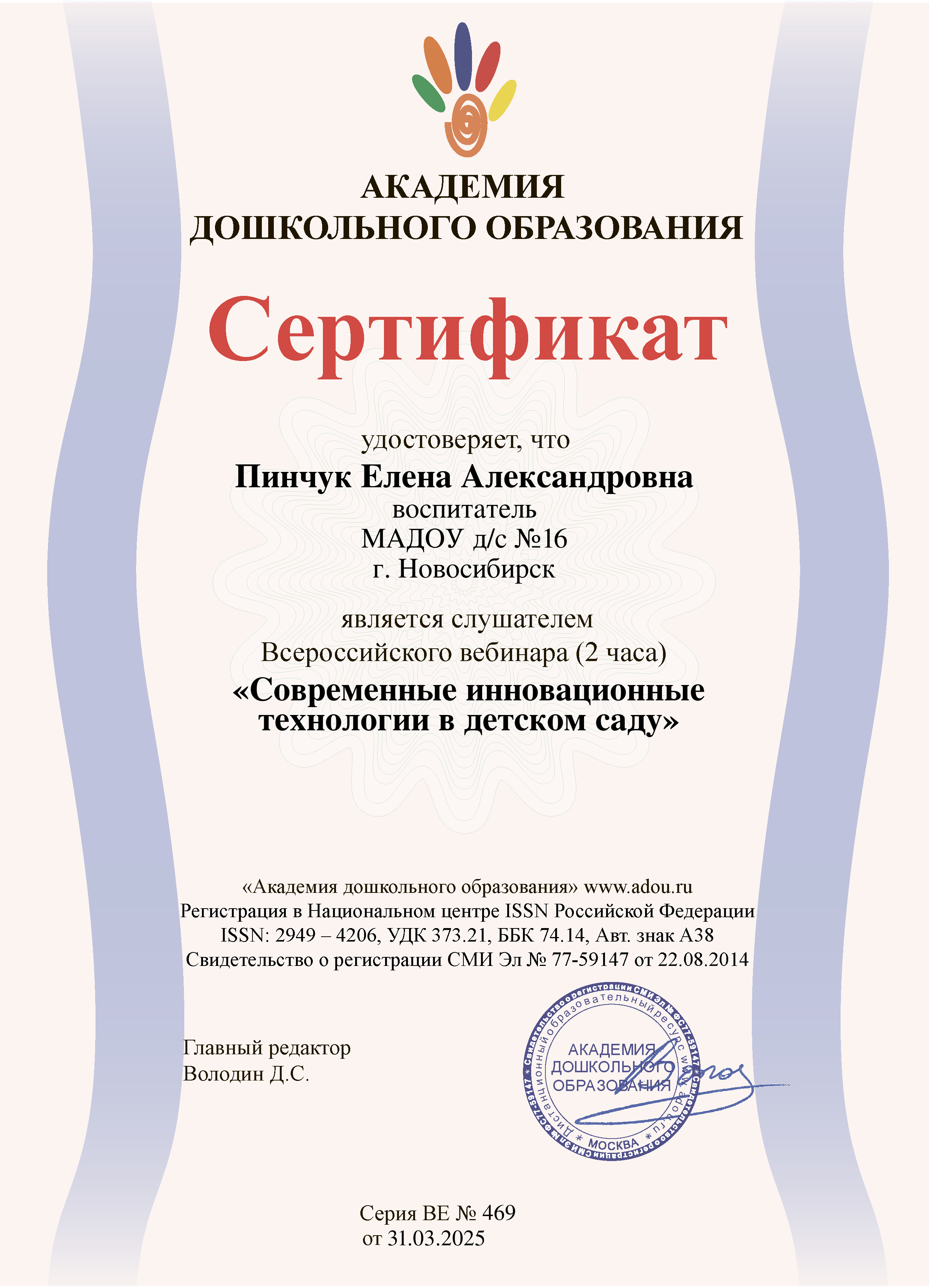 Сертификат слушателя вебинара по теме: «Современные инновационные технологии в детском саду», 2 часа, 2025г.