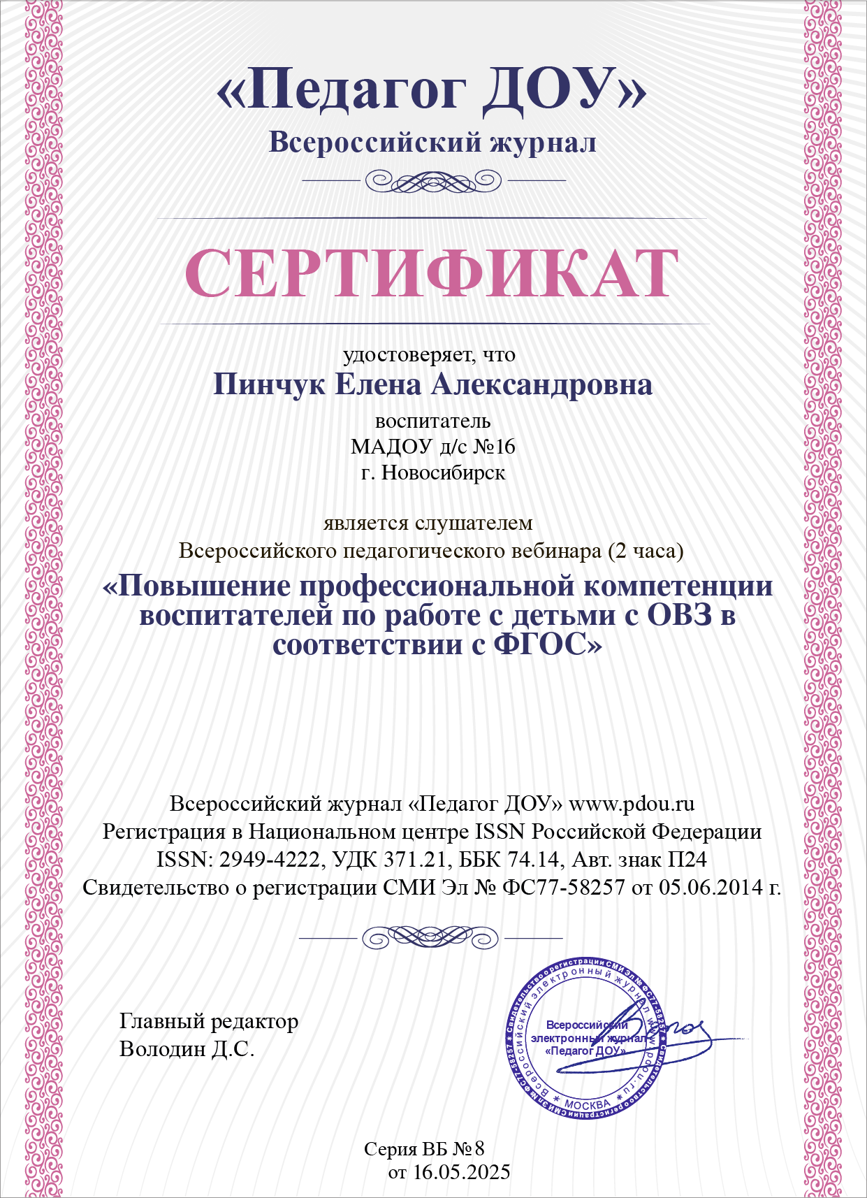 Сертификат слушателя вебинара «Повышение компетенции воспитателей по работе с детьми ОВЗ в соответствии с ФГОС», 2 часа, 2025г.