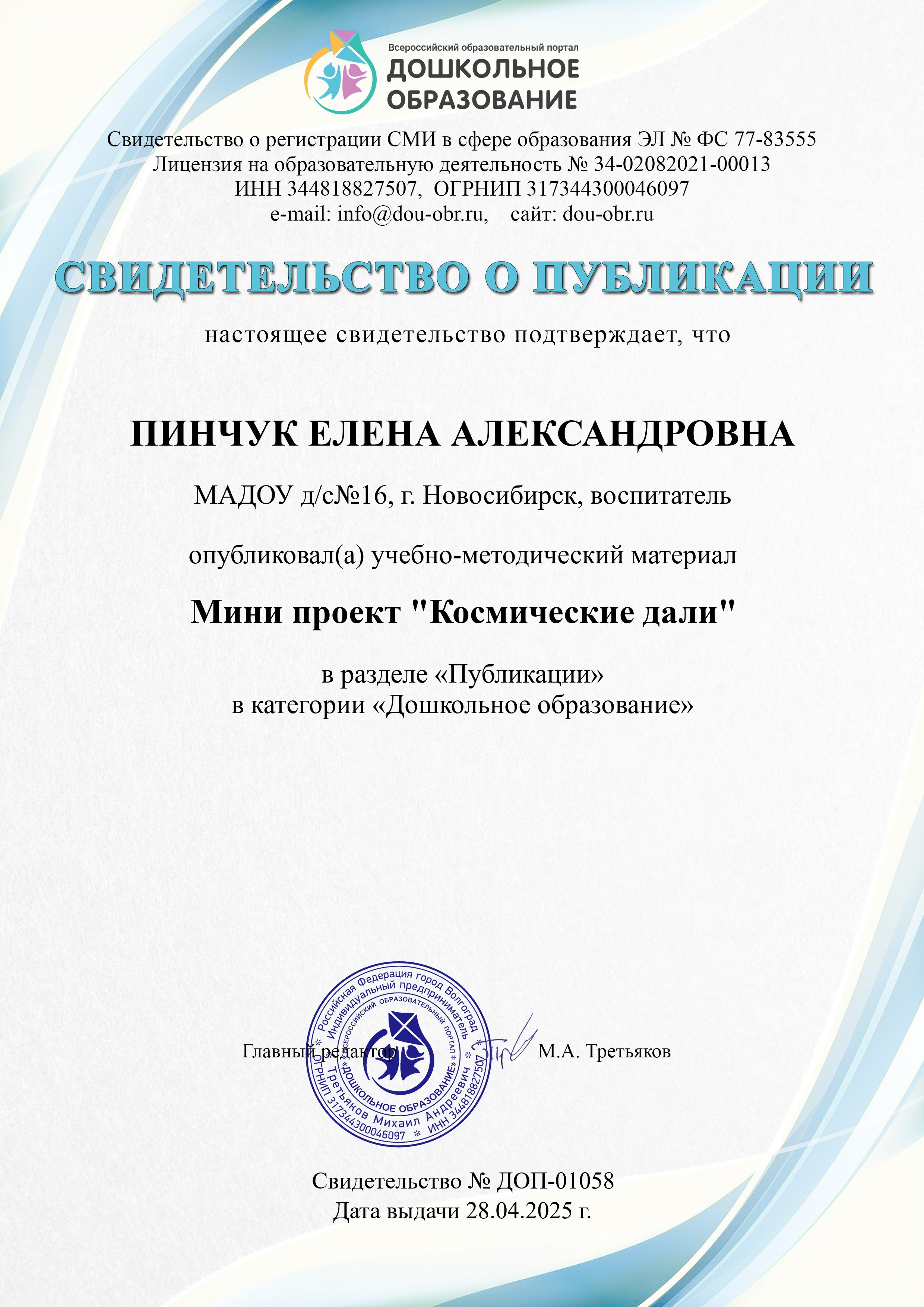 Публикация на всероссийском портале «Дошкольное образование» учебно-методического материала: «Мини проект «Космические дали»» // 2025.