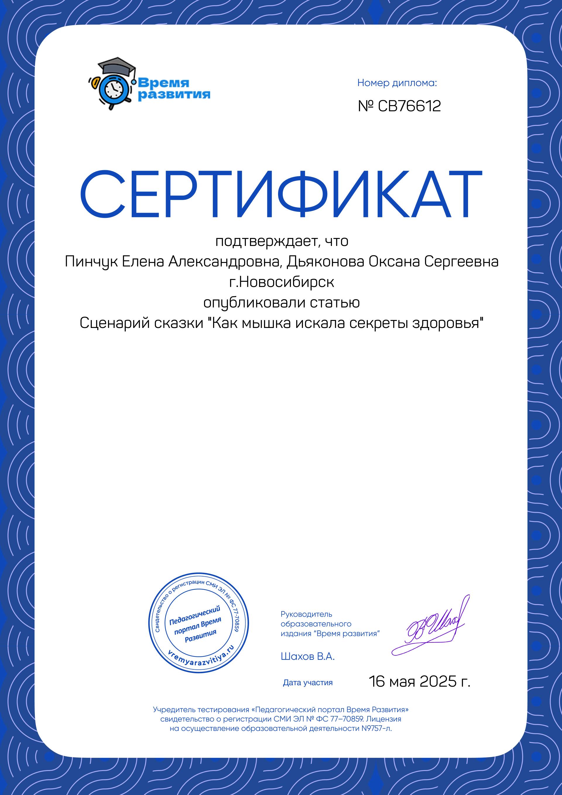 Публикация на педагогическом портале «Время знаний»: Сценарий сказки «Как мышка искала секреты здоровья» // 2025.